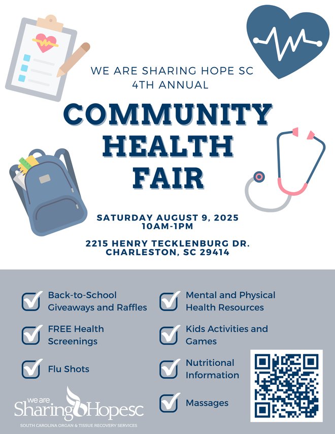 We Are Sharing Hope SC is a local nonprofit with a goal of assisting the families of organ donors and recipients through the processes of organ donation in South Carolina. This event helps raise awareness for organ donation and transplantation across South Carolina by providing health resources and education to the Lowcountry.